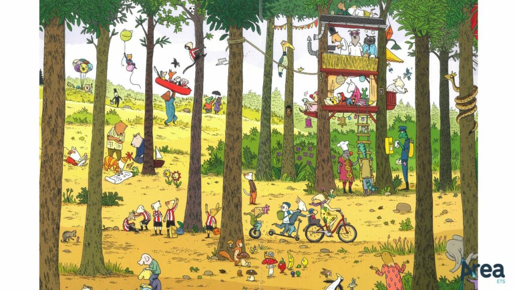 Capre, lucertole, orsi, maiali e chi più ne ha più ne metta: nel paese brulicante immaginato da Philip Waechter c’è spazio per gli animali più disparati, immortalati in atteggiamenti e costumi tipicamente umani. Il tratto è quello caratteristico dell’autore tedesco: amichevole e sorridente, instilla nel lettore l’immediato desiderio di immergersi in un mondo che appare insieme familiare e curioso, buffo e rassicurante. E voilà, in un attimo ci siamo dentro con tutte le scarpe! Da lì in avanti, non ci resta che seguire la matita dell’autore il cui sguardo si sposta man mano dalla piazza per approdare ai prati circostanti, poco più avanti al laghetto, poi al bosco limitrofo e infine al campo sportivo ai bordi della città.
