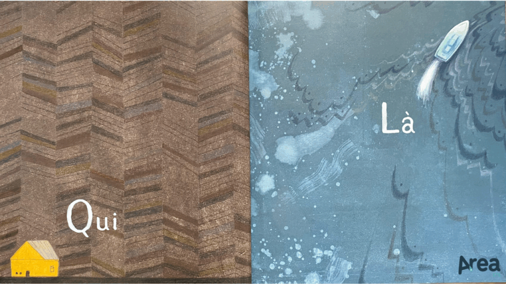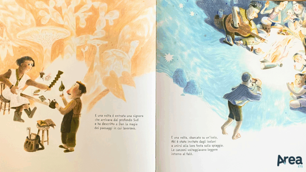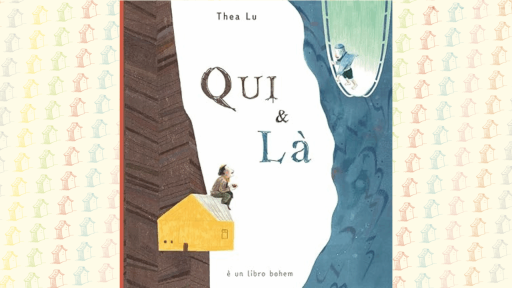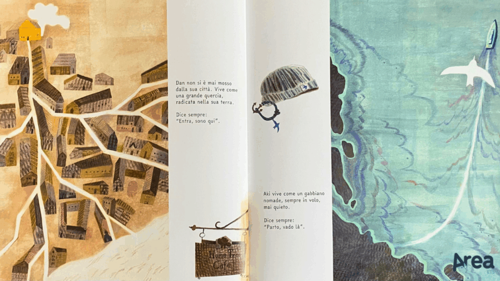 Costruito con minuzia, nei contenuti come nella forma, su un’idea di simmetria e specularità, Qui & Là non si limita a proporre i ritratti di due personalità che dialogano tra loro ma dà vita a una storia compiuta in cui mondi diversissimi finiscono per incontrarsi. Così, dopo una sequenza di doppie pagine spaccate a metà, in cui il mondo di Dan e il mondo di Aki viaggiano in parallelo, ben distinti anche dai toni dominati rispettivamente del marrone e del blu, il libro abbraccia il lettore con una doppia pagina finale che si apre dando spazio al momento in cui i toni si mescolano e le storie si intrecciano.