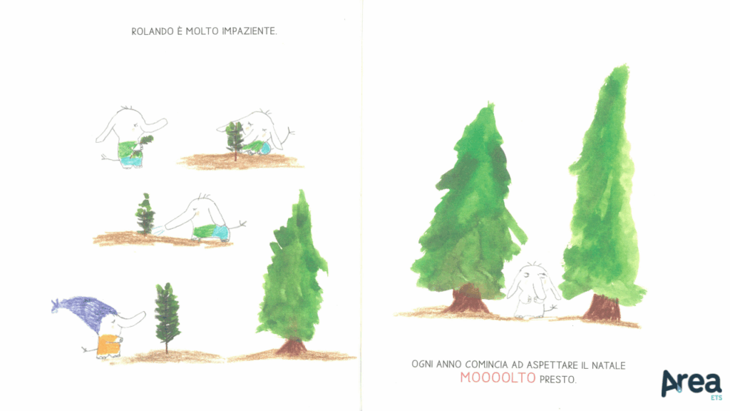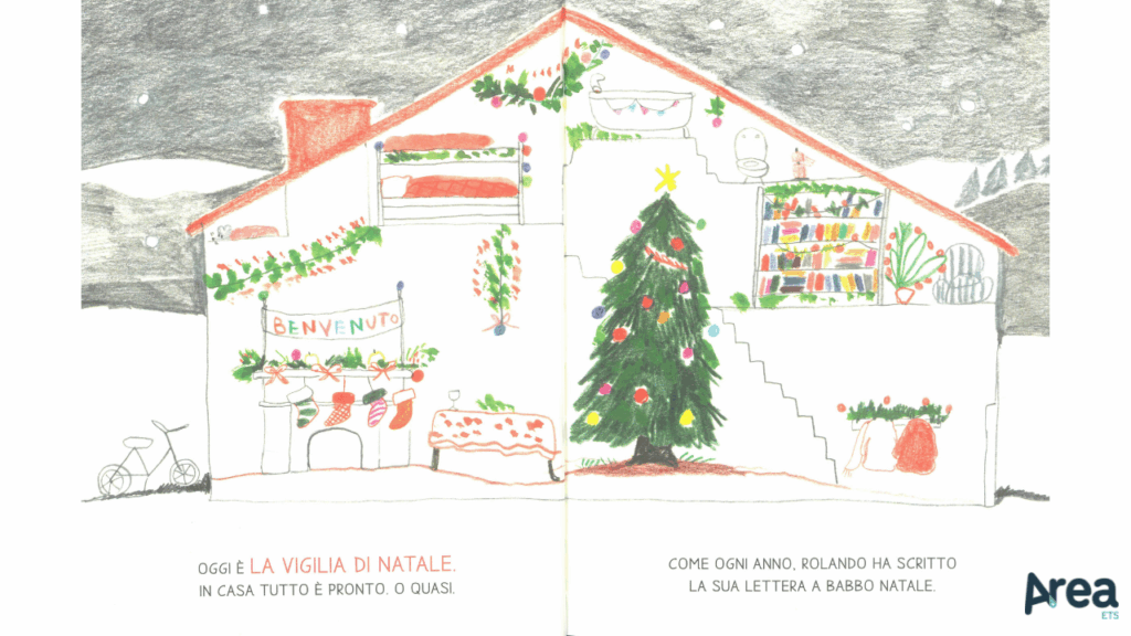 Snello e frizzante, proprio come i volumi che lo hanno preceduto, Rolando Lelefante festeggia il Natale mantiene intatta la capacità di coniugare piccole avventure vivaci e compiute con testi minimi e abbordabili. Ogni pagina presenta, infatti, un paio di righe al massimo, stampate in maiuscolo e con font ad alta leggibilità leggimiprima. Lessico e sintassi sono piani e amichevoli, senza per questo risultare banali o piatti. Le illustrazioni, dal canto loro, vantano un ruolo importante. Contraddistinte da un tratto delicato e volutamente poco rifinito, danno vita a scene molto godibili e dinamiche, punteggiate da dettagli sfiziosi.