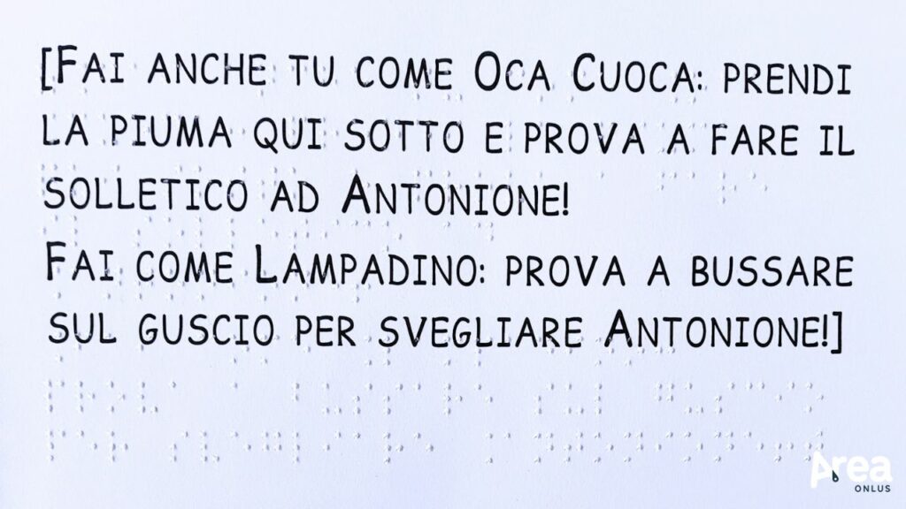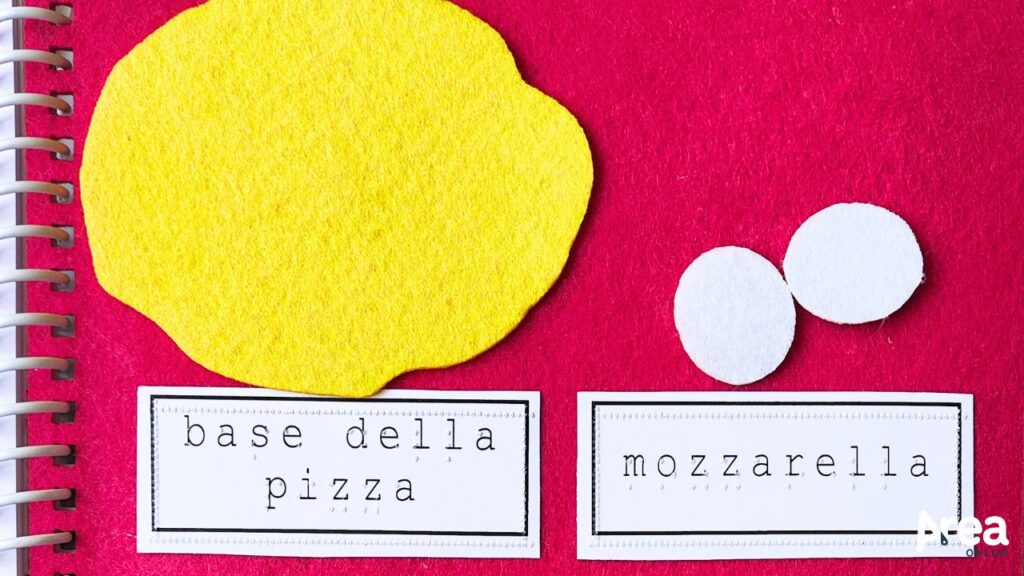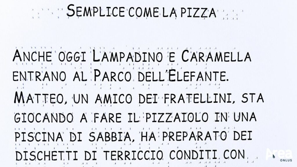 Contraddistinto dalla consueta attenzione all’accessibilità, Semplice come la pizza è realizzato in tre versioni diverse: ad alta leggibilità, in simboli e in Braille con inserti tattili. Quest’ultima presenta un aspetto piuttosto scarno: le pagine, rilegate a spirale, contengono essenzialmente solo testo, in nero e in Braille. Solo una pagina è caratterizzata, dal canto suo, dalla presenza di un’illustrazione tattile con la quale il lettore è invitato a interagire (una piuma staccabile con cui fare il solletico alla tartaruga addormentata). La maggior parte degli inserti tattili è collocata invece al fondo del volume: qui il lettore può trovare infatti una doppia pagina in feltro dalla quale è possibile staccare (e poi riattaccare grazie alla presenza del velcro) diversi ingredienti tipici della pizza. Non particolarmente stimolanti dal punto di vista dell’esplorazione tattile, poiché realizzati con un unico materiale (il feltro, per l’appunto), questi risultano però interessanti dal punto di vista ludico poiché consentono di giocare ai pizzaioli e mettere così in pratica le ghiotte vicende dei due protagonisti.