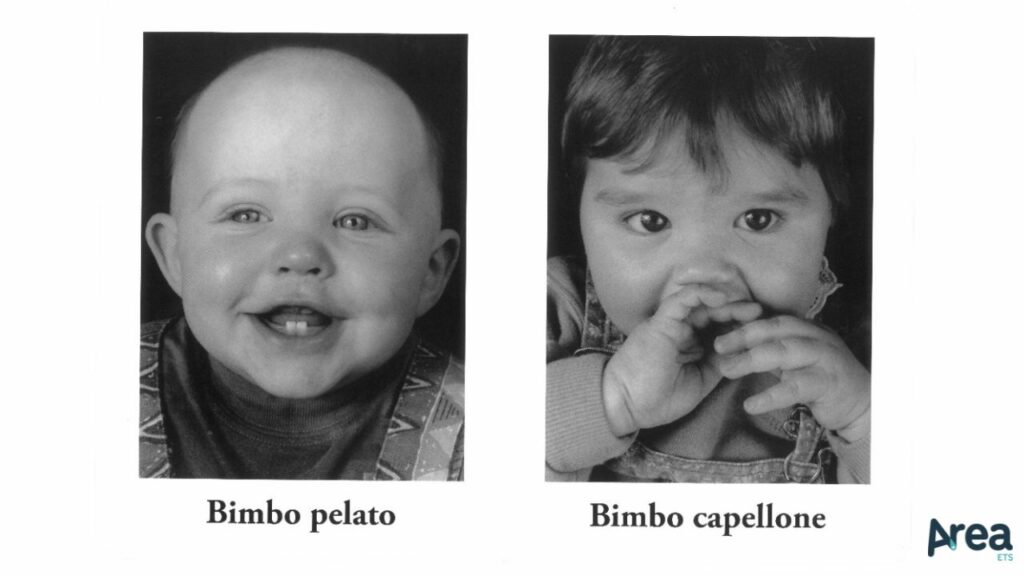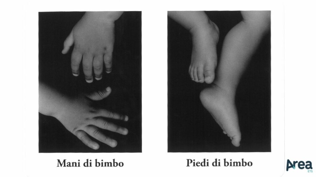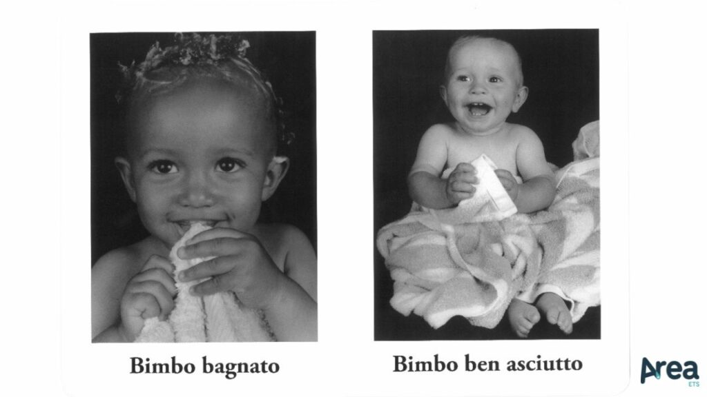 Ogni pagina presenta una fotografia piuttosto ampia che ritrae un bebè e, subito sotto, pochissime parole di didascalia (perlopiù secondo la struttura ricorrente bimbo+aggettivo o bimbo+verbo). La pagina a fianco, dal canto suo, dialoga con la precedente giocando sui contrasti (Bimbo ride / Bimbo piange; Bimbo vestito / Bimbo tutto nudo; Bimbo bagnato / Bimbo ben asciutto, per esempio): aspetto, questo, che diversifica i livelli e le possibilità di fruizione del libro. Il risultato è una sequenza corposa e non piatta di immagini da osservare e nominare, in cui riconoscersi e con cui dialogare, che si chiude con l’immancabile specchio nel quale il bambino-lettore può finalmente aggiungere alla carrellata di ritratti anche il suo.
