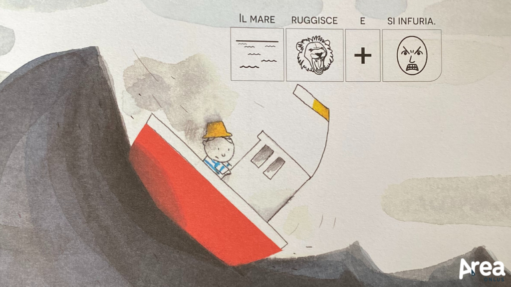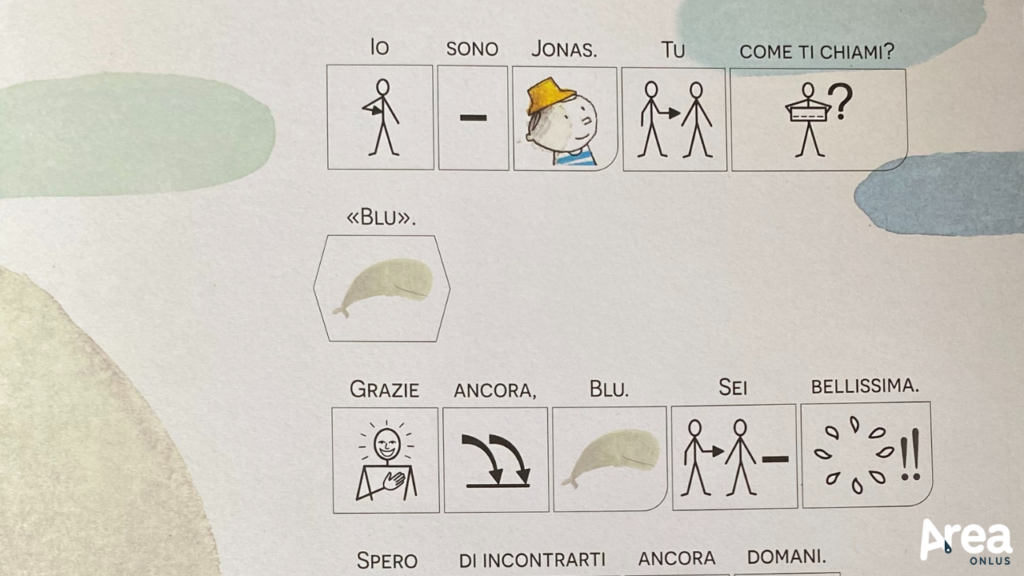 Per il resto, il lessico è piano, le frasi sono piuttosto brevi e paratattiche e le scelte di simbolizzazione fatte da Enza Crivelli e Sante Bandirali vanno nella direzione di ottimizzare i pittogrammi impiegati e di rafforzarne il legame con il testo. Così, per esempio, là dove il testo riporta solo il verbo, il riquadro sottostante riporta anche il simbolo del soggetto o dell’oggetto a cui il verbo si riferisce (“sei” è associato al simbolo di tu e a quello di essere, “incontrarti” al simbolo di incontrare e a quello della balena, e via dicendo…). Sempre nell’ottica di facilitare la comprensione del testo e la distinzione delle sue diverse parti, va l’accorgimento ormai consueto nei libri di Officina Babùk per cui la forma del riquadro del pittogramma cambia (forma a punta) quando posto in corrispondenza dell’inizio e della fine di un discorso diretto così come quando è posto alla fine di una frase di qualunque altro genere (forma tondeggiante). L’obiettivo è sempre quello di supportare il più possibile la piena appropriazione del racconto, anche quando questo, come nel caso di Ti voglio bene, Blu, un po’ più sfidante del consueto per i lettori che necessitano dei simboli della CAA.