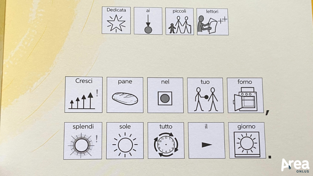I testi di Tiritera giornaliera sono piani ma non piatti, piacevoli da dire e ascoltare anche più volte e fruibili nonostante la struttura sintattica della frase venga talvolta condizionata dalla rima. Stampati in minuscolo, sono supportati visivamente dai simboli WLS – Widgit Literacy Symbols – della Comunicazione Aumentativa e Alternativa che aiutano il bambino, soprattutto ma non solo con difficoltà comunicative, a seguire a comprendere la narrazione. I simboli sono in bianco e nero, riquadrati insieme alle parole corrispondenti, associati a singoli lemmi e provvisti di qualificatori che indicano eventuali plurali o tempi verbali diversi dal presente.