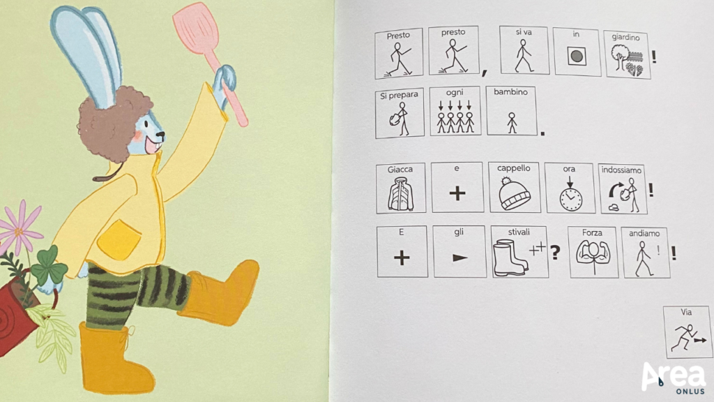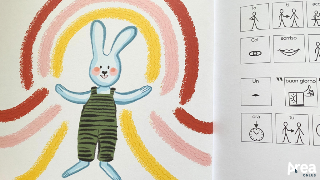 Ogni filastrocca è associata a un’illustrazione dai toni pastello. L’interprete di ogni azione o attività è un tenero coniglio in salopette dall’aria amichevole. Le illustrazioni sono sempre minimali, prive di tinte accese e dettagli superflui che possano risultare disturbanti. È interessante notare, inoltre, come esse vengano sempre collocate su una pagina diversa da quella del testo corrispondente, così da agevolare l’orientamento del lettore e la lettura dell’oggetto libro prima ancora che della storia. Nella fattispecie, la pagina in questione è quella di sinistra, ossia la prima che il bambino incontra sfogliando la pagina: una scelta non trascurabile perché dà prima di tutto valore alla lettura delle figure, di fatto quella principale e prioritaria per i bambini in età prescolare e per i bambini con difficoltà comunicative.