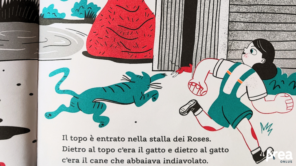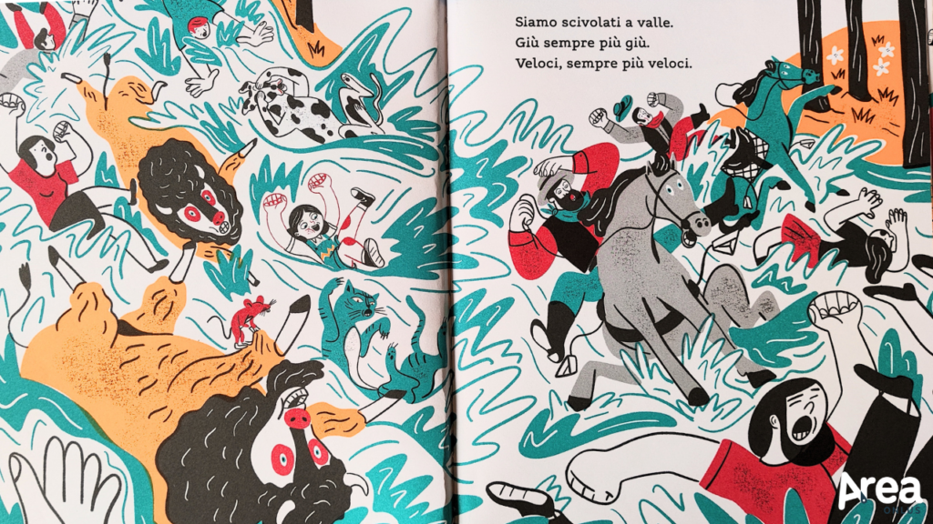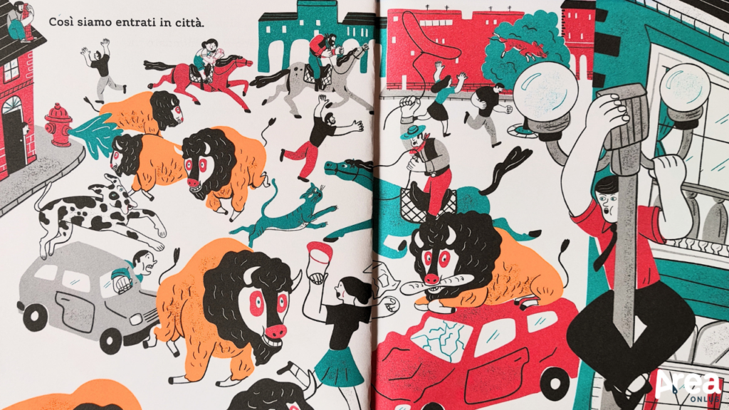 Queste ultime, caratterizzate da grande dinamismo e da un numero limitato di colori accesi e fluo, la fanno infatti da padrone nell’aggiungere dettagli sfiziosi al racconto, dicendo molto di più di quel che esplicitano le parole. Ne vien fuori una narrazione dal forte impatto visivo, che ben asseconda la propensione di tanti lettori, riluttanti o dislessici per esempio, ad apprezzare storie che sanno essere ricchissime anche con testi piccini picciò.