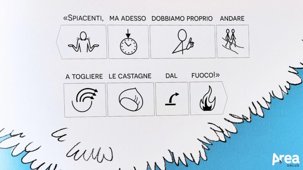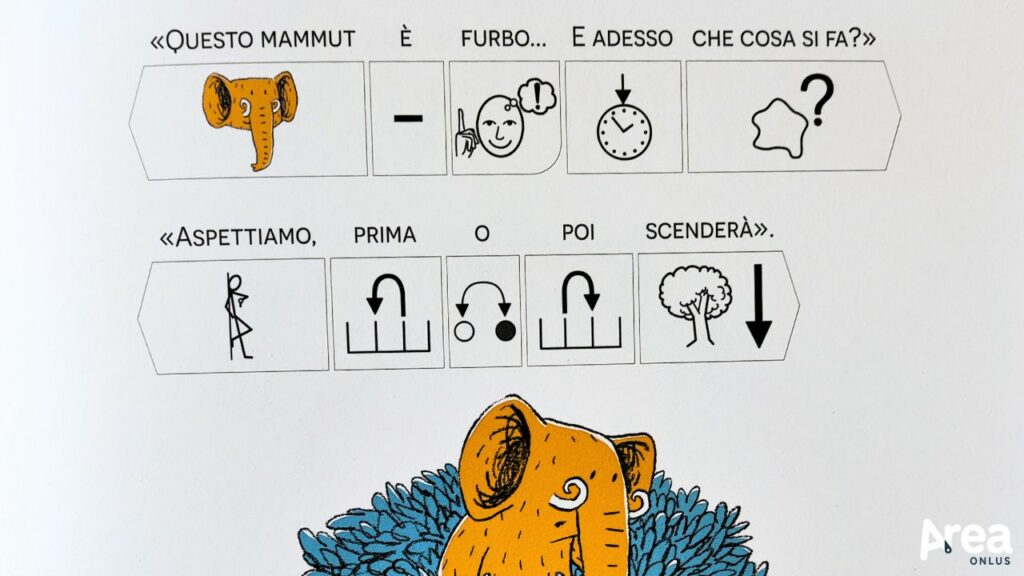 In catalogo per Babalibri nella sua versione tradizionale, Un mammut in frigorifero è ora reso disponibile in versione in simboli da Officina Babùk. Questa appare contraddistinta, come gli altri volumi dell’editore, da testo in maiuscolo supportato visivamente da simboli WLS, simbolizzazione per unità di senso, testo esterno ai riquadri (sottili) e riquadri dalle forme diverse per segnalare la fine di una frase e l’apertura o la chiusura di un discorso diretto. Nel caso di Un mammut nel frigorifero quest’ultima accortezza è particolarmente significativa poiché il volume procede praticamente per intero attraverso i dialoghi. Non esplicitamente attribuiti, questi possono complicare un poco la comprensione da parte di bambini che presentano maggiori difficoltà a compiere inferenze. Per contro, il testo sembra nato per supportare la simbolizzazione dal momento che si compone di frasi brevi e brevissime, perlopiù dalla struttura lineare. Comparata alla versione originale, quella in simboli mostra di conseguenza un numero davvero irrisorio di modifiche, perché il testo appare naturalmente chiaro e fruibile.
