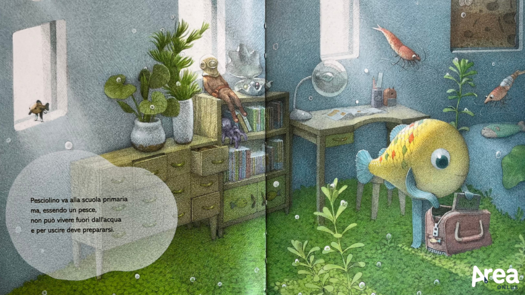Non solo. Sempre senza sottolineare la cosa, l’autrice costruisce un mondo in cui sì, Pesciolino è molto più diverso dagli altri, ma in cui in realtà ciascuno ha una sua specifica identità. Pesciolino non vive cioè da pesce in un mondo di bambini ma da pesce in un mondo di creature terrestri variegate: uccelli, lucertole, bambini e gatti, solo per dirne alcuni. E questo fa una grande differenza perché di fatto ci dice che la diversità ha tante forme e che ciascuno può a suo modo sperimentarlo. Analogamente, appare di grande effetto la scena in cui gli amici Lucertola e Bambino vanno a trovare il protagonista. Sono loro, in questo caso, a dover indossare il casco per potersi tuffare dentro la camera di Pesciolino. Qui pesciolino non ne ha bisogno perché è per l’appunto l’ambiente a renderci più o meno abili. Il testo ci dice: “Giochiamo nella mia stanza – risponde Pesciolino e gli fa segno di entrare. Lucertola e Bambino indossano il casco e splash, si tuffano in acqua”. Nessuna sottolineatura, nessun dilungamento inutile sulla faccenda. Ma con quanta forza arriva il messaggio?