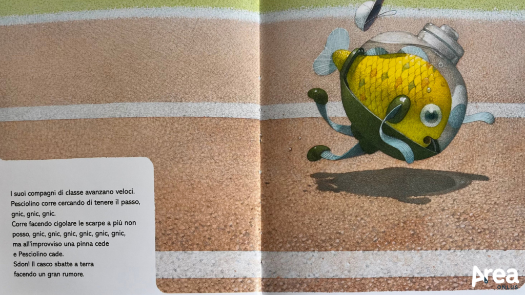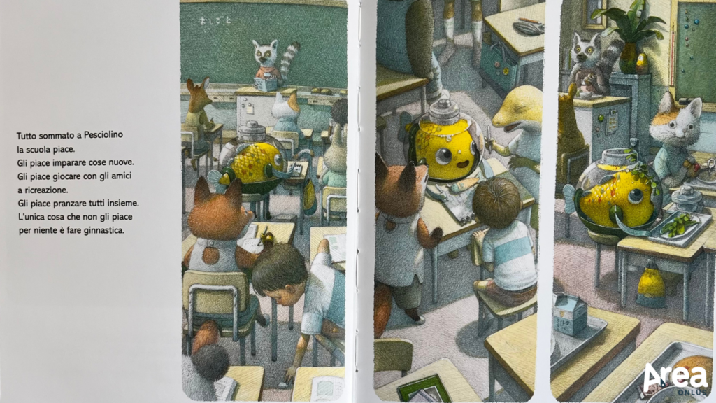Ma andiamo con ordine. Il protagonista di Un pesce fuor d’acqua è un pesciolino che frequenta la scuola primaria. Vive in una casa acquatica ma per uscire e riuscire a respirare deve indossare un pesante casco di acqua riempito. Questo, unito all’assenza di veri e propri arti, rende un po’ più complesse alcune attività quotidiane come scrivere o mangiare, e molto più ostiche alcune attività frequenti come correre durante l’ora di educazione fisica. Ma Pesciolino è un tipo tosto e vuole fare ciò che fanno i suoi compagni. Così a correre prova lo stesso, incappando però in un brutto incidente che lo tiene bloccato a casa per un po’ e che soprattutto ne mina profondamente l’autostima. Sarà la visita e il regalo inaspettato di due amici a dare una svolta alla situazione, mettendo in evidenza l’impatto che il contesto può avere sulla percezione di una disabilità (o più genericamente di un senso di maggiore o minore adeguatezza).