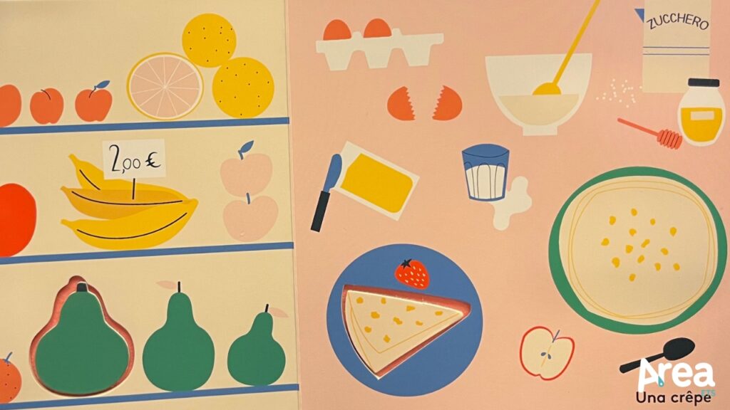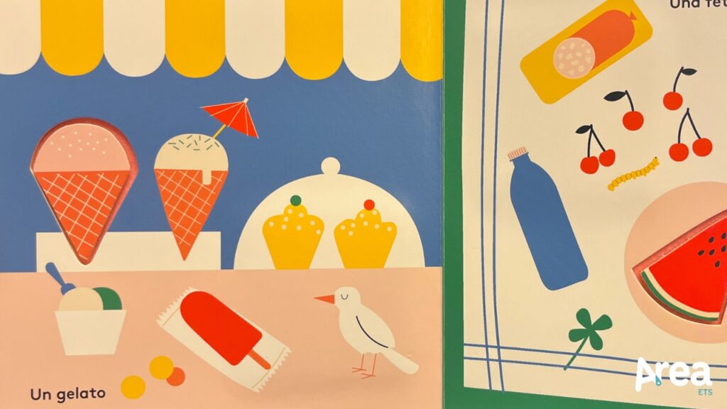 Il libro presenta intanto un packaging particolare che consente alla copertina di aprirsi in verticale mentre tutte le altre pagine, spesse e cartonate, si aprono in orizzontale. Questo fa sì che ciò che sta sotto alla copertina, ossia l’immagine del lupo protagonista con il suo pancione da riempire in primo piano, resti sempre a disposizione man mano che il libro scorre: un’accortezza semplice ma funzionale considerando che il lettore viene implicitamente invitato a dare da mangiare al lupo le delizie che di pagina in pagina incontra. Ciascuna delle pagine successive alla prima presenta infatti un insieme di cibi variamente disposti (su ripiani, sparsi qua e là, su una tovaglia…) e riuniti in base ad affinità di contesto (cibi che stanno in frigo, cibi per l’ora del tè, cibi per un picnic…). Ogni pagina riporta una decina di immagini dalle forme semplici e riconoscibili: una di esse, poi, è associata al nome e risulta staccabile, esplorabile a 360°e attaccabile sulla pancia del lupo tramite velcro.