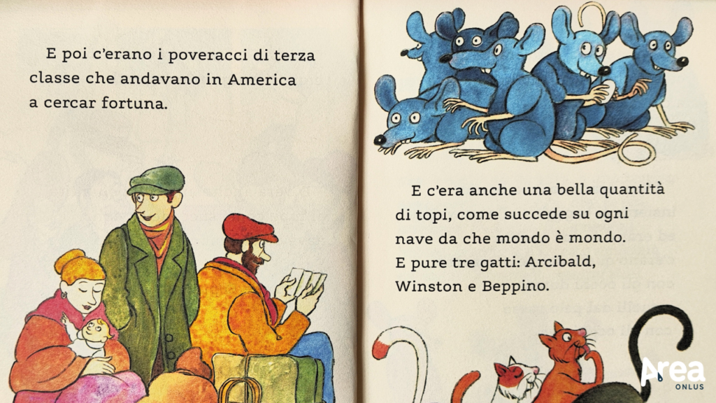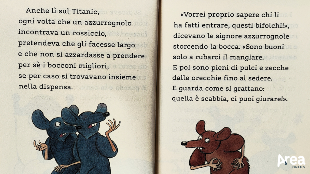 Di due tipi diversi e rivali, i topi rossicci e quelli azzurrognoli non si possono nemmeno incrociare senza lasciarsi andare a risse e scontri verbali. In virtù di una lunga storia di lotte, guerre e soprusi, i due gruppi di roditori non fanno che insultarsi a vicenda e battersi gli uni contro gli altri. Due di loro, però, l’azzurrognola Eloisa e il rossiccio Abelardo, se ne infischiano altamente delle storiche beghe tra le rispettive fazioni di appartenenza e amano giocare insieme. E sarà proprio questa loro capacità di non lasciarsi condizionare dalla provenienza e di guardare al futuro più che al passato, a garantire loro una fuga riuscita al momento dell’impatto con l’iceberg e una prospettiva di nuova vita una volta giunti in America.