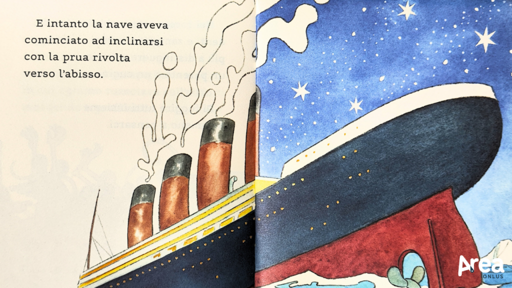 Come ogni nave che compia lunghe tratte, anche il Titanic trasportava una serie di passeggeri senza biglietto e con una lunga coda: topi e topini viaggiatori. E proprio topi e topini sono i protagonisti della storia ad altra leggibilità scritta e illustrata da Cecco Mariniello per Sinnos, Violetta e i topi del Titanic.