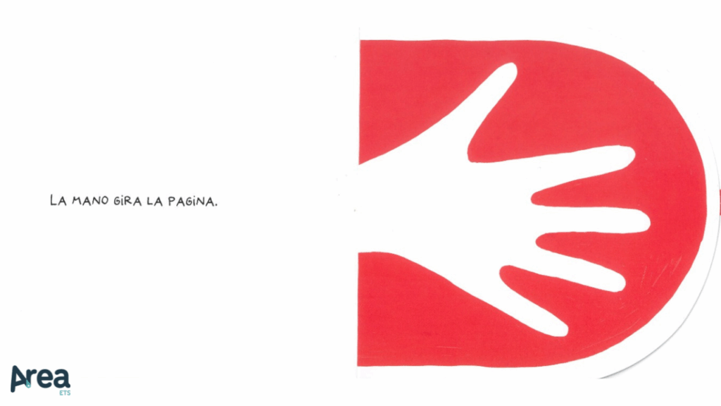 Fruibile fin dai 2 anni, il libro presenta a ogni pagina buchi, alette e forme con le quali interagire, secondo le indicazioni essenzialissime e mirate fornite dal testo. Protagonista assoluta e dichiarata del libro è la mano del lettore: una mano che gira, segue, cerca, si muove, tocca, collega, sfrega, bussa, prende, salta e balla. È una mano in movimento, dunque, che dialoga senza posa con le figure presenti. Minime e in gran parte astratte, sempre contraddistinte dai soli colori primari, queste si stagliano chiarissime sullo sfondo bianco, creando le condizioni ideali per un agevole orientamento da parte del lettore. Il testo, dal canto suo, sposa il medesimo principio di essenzialità: poche e immediate parole suggeriscono al lettore cosa fare in ogni pagina.