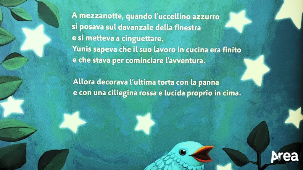 Yunis è un abilissimo e generoso pasticcere. Tutti i giorni confeziona con le sue mani delizie prelibate e le lascia di nascosto in dono ai bambini del villaggio. Il suo marchio è un uccellino azzurro sulla confezione, identico all’uccellino in piume e ossa che ogni sera fa visita a Yusif nella sua cucina. Da qui il ragazzo si sposta poco, non mostrandosi in pubblico praticamente mai. Chi crederebbe, infatti, che dolci così così sopraffini e ben realizzati possano essere fatti da una ragazzo con la sindrome di Down?, pensa. Ma quando, un giorno, Yunis si ammala e il consueto pacchetto di dolci non può raggiungere i bambini, questi fanno due più due e svelano il mistero dei pasticcini dell’uccellino azzurro. Il talento di Yunis può a quel punto uscire allo scoperto, sostenuto da un atteggiamento collettivo libero dai fardelli del pregiudizio.