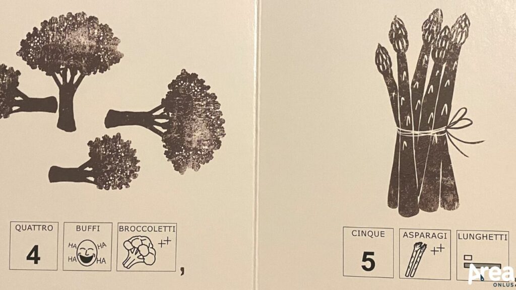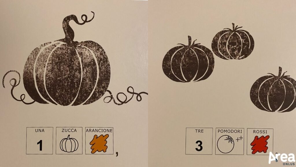 A questo scopo concorrono in particolare i testi di Daniela Casotti composti con una certa attenzione alla rima e alla musicalità e le suggestive illustrazioni di Piki realizzate in forma di timbro. Minimali – nei dettagli e nel cromatismo -, queste ultime si accompagnano a testi parimenti asciutti dando vita a una pagina pulita, piacevole e comunicativamente efficace. Dal canto loro, i testi (in font maiuscolo) si caratterizzano per strutture sintattiche lineari ed essenziali e vengono supportati visivamente da simboli WLS riquadrati, di dimensione adeguata, in numero ridotto (non più di cinque per pagina) e dotati di qualificatori di numero.