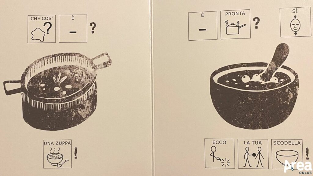 Zuppa di coccole è il primo libro cartonato in simboli edito da Homeless book. Ha pagine spesse, testi minimi e illustrazioni essenziali: tutte caratteristiche che lo rendono particolarmente adatto alla lettura condivisa con un pubblico di lettori piccoli e piccolissimi.
